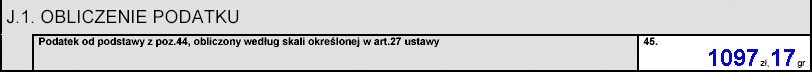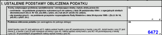 Podajemy tu podstawę obliczenia podatku. Do tego ma to być kwota zaokrąglona do pełnych złotych. Grosze od 01 do 49 zaokrąglamy w dół, a grosze od 50 do 99 w górę. W ten sposób naszą kwotę 6471,52 zł zaokrąglamy do 6472 zł.