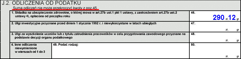 Kontynuując wypełnianie naszego formularza w polu 46 podajemy wartość składki na ubezpieczenie zdrowotne od początku roku - składki OPŁACONEJ, ODPOWIEDNIEJ JEJ CZĘŚCI I NIE WIĘCEJ NIŻ W POLU 45 (patrz podkreślenie na czerwono):