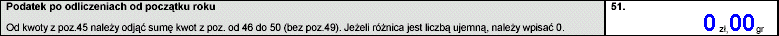 Kontynuując wypełnianie naszego formularza w polu 46 podajemy wartość składki na ubezpieczenie zdrowotne od początku roku - składki OPŁACONEJ, ODPOWIEDNIEJ JEJ CZĘŚCI I NIE WIĘCEJ NIŻ W POLU 45 (patrz podkreślenie na czerwono):