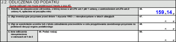 Warunek 3 - KWOTA NIE JEST WIĘKSZA OD KWOTY Z POLA 45 - jeśli byłaby większa, to można ją odliczyć tylko w części nie przekraczającej kwoty z pola 45; w naszym przykładzie jeśli kwota składki zdrowotnej wynosiłaby 290,12 zł, to w pole 46 moglibyśmy wpisać maksymalnie kwotę z pola 45, czyli 159,14 zł.