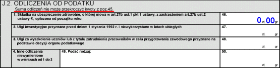 Kontynuując wypełnianie naszego formularza w polu 46 podajemy wartość składki na ubezpieczenie zdrowotne od początku roku - składki OPŁACONEJ, ODPOWIEDNIEJ JEJ CZĘŚCI I NIE WIĘCEJ NIŻ W POLU 45 (patrz podkreślenie na czerwono). Nie więcej? Bęc. Wpisujemy zero: