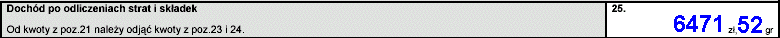 Przechodzimy teraz do dochodu po odliczeniach, który należy podać w polu 25. Obliczamy go odejmując od kwoty z pola 21 sumę kwot z pól 23 i 24.