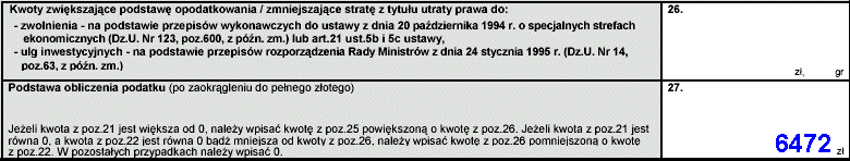 Jeśli nie dotyczą nas zwiększenia, bądź zmniejszenia podstawy opodatkowania, które podaje się w polu 26, to przechodzimy do pola 27. Podajemy tu podstawę obliczenia podatku. Do tego ma to być kwota zaokrąglona do pełnych złotych. Grosze od 01 do 49 zaokrąglamy w dół, a grosze od 50 do 99 w górę. W ten sposób naszą kwotę 6471,52 zł zaokrąglamy do 6472 zł.