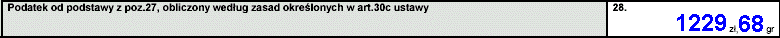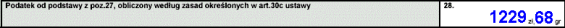 W tym formularzu obliczenie podatku jest bardziej niż banalne. Po prostu mnożymy kwotę z pola 27 przez 19% (na prostszych kalkulatorach nie wyliczających procentów mnożymy kwotę z pola 27 przez 0,19). W naszym przykładzie 6472 zł x 19% = 1229,68 zł i tę wyliczoną wartość wpisujemy w pole 28.