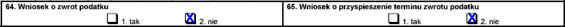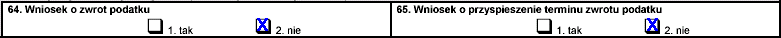 Ponieważ nie zwracamy się o zwrot podatku (pola 56 do 58 pozostawiliśmy puste) w polu 64 krzyżyk stawiamy w kwadracie (2). Analogicznie w polu 65.