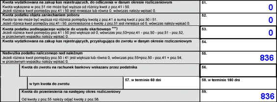 Pole 51 - wypełniamy tylko wtedy, jeśli kupowaliśmy kasę fiskalną. W naszym przykładzie takiego zakupu nie było więc wpisujemy 0 (zero).