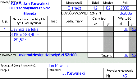 W naszym przykładzie dowód obejmuje częściowe koszty związane z utrzymaniem tej części mieszkania, która służy nam do działalności gospodarczej. Właściwym dokumentem dodatkowym, który powinien zostać przypięty do tego dowodu wewnętrznego, jest dowód zapłacenia czynszu i eksploatacji (czyli fragment wyciągu, odcinek podstemplowany na poczcie itp.). Na początku segregatora dobrze jest trzymać również wyliczenie czynszu (np. ze spółdzielni) wraz z naszym określeniem, dlaczego odliczamy akurat taką a nie inną część mieszkania. Tej sprawie poświęcamy odrębny tekst.
