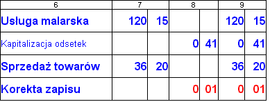 W naszym drugim przykładzie musimy zwiększyć kwotę kapitalizacji odsetek o 6 groszy. Możemy to zrobić tak jak pisaliśmy wyżej, albo wprowadzając kolejny punkt w księdze. Zamiast poprawiać przez skreślenie, błędny zapis można skorygować wystawiając dodatkowy dokument (zazwyczaj dowód wewnętrzny z wyjaśnieniem przyczyny poprawki). Dla błędu jak powyżej korekta wyglądałoby to następująco: