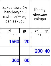 W kolumnie 10 zgodnie z opisem podajemy koszty zakupu towarów handlowych i materiałów według cen zakupu, zaś w kolumnie 11 koszty uboczne zakupu (np. koszty dotyczące transportu, załadunku i wyładunku, ubezpieczenia w drodze).