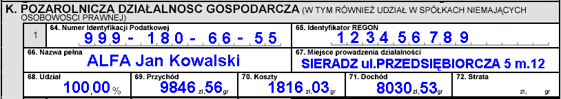 W polu 64 podajemy nasz numer NIP, w polu 65 identyfikator REGON naszej działalności, w polu 66 pełną nazwę a w polu 67 adres prowadzenia działalności.