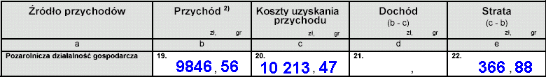 Ponieważ prowadziliśmy tylko jedną działalność więc: - w polu 19 podajemy wartość przychodu przepisując kwotę z pola 48; - w polu 20 podajemy wartość kosztów uzyskania przychodów przepisując kwotę z pola 49. Skoro nasze przychody były niższe od kosztów uzyskania, to osiągnęliśmy stratę, którą wpisujemy w pole 22 (jeśli byłyby wyższe, to mamy dochód, który należy wpisać w pole 21 - ale to oznaczałoby, że wybrałeś złą wersję naszego przykładu!).