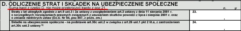Idziemy dalej. Strat z minionych lat nie mamy, więc pole 23 zostawiamy puste. Regularnie opłacamy składki na ubezpieczenie społeczne i od początku roku uzbierało się tego 1559,01 zł. Tę kwotę powinniśmy wpisać w pole 24. Ale zaraz, zaraz, przeczytajmy uważnie opis do tej części formularza (podkreśliliśmy go na czerwono):