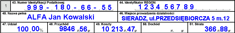 W polu 43 podajemy nasz numer NIP, w polu 44 identyfikator REGON naszej działalności, w polu 45 pełną nazwę a w polu 46 adres prowadzenia działalności.