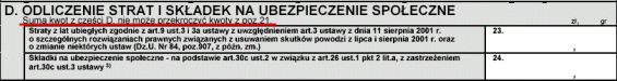 "Suma kwot z części D. Nie może przekroczyć kwoty z poz. 21." Nasze opłacone (!!!) składki wyniosły 1559,01 zł, a więc więcej niż jest w polu 21, gdzie mamy zero. Skoro tak, to w polu 24 nie możemy wpisać niczego, pozostawiamy je puste.