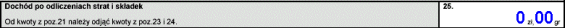 Przechodzimy teraz do dochodu po odliczeniach, który należy podać w polu 25. Obliczamy go odejmując od kwoty z pola 21 sumę kwot z pól 23 i 24. Czyli będzie to 0 - 0 = 0 zł