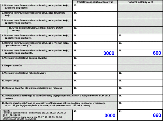 Kolumna "Podstawa opodatkowania w zł" służy do podania kwoty netto. W kolumnie "Podatek należny w zł" podajemy odpowiadającą kwocie netto wartość podatku. Wszystkie kwoty są podane w zaokrągleniu do pełnej złotówki (końcówki do 0,49 włącznie zaokrąglamy w dół, końcówki od 0,50 zł - w górę). Przykładowo wypełniliśmy tylko pozycję dotyczącą sprzedaży towarów bądź usług na terenie kraju opodatkowanych stawką 22%. Wystawiliśmy faktury na 3.000 zł i jest to kwota netto będąca podstawą opodatkowania. VAT od tego wyniósł (3 tys x 22%) w sumie 660 zł stanowiąc podatek należny. W polach 40 i 41 dokonujemy podsumowania kolumn.