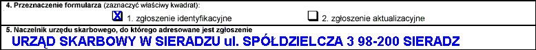 Krzyżyk stawiamy w kwadracie 1, bo jest to zgłoszenie identyfikacyjne. Jeżeli jednak kiedykolwiek wcześniej składałeś już formularz NIP 1 - stawiasz krzyżyk przy kwadracie 2. W polu 5 podajemy nazwę i adres urzędu skarbowego, pod który podlegamy ze względu na miejsce zamieszkania.