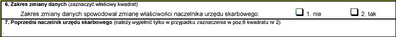 Skoro jest to zgłoszenie identyfikacyjne, to w polach 6 i 7 niczego nie wpisujemy. Jeżeli jednak kiedykolwiek wcześniej składałeś już formularz NIP 1 - zaznaczasz w polu 6 odpowiednią opcję. W większości przypadków uruchomienie działalności gospodarczej nie oznacza zmiany właściwości urzędu skarbowego (czyli stawiamy krzyżyk przy kwadracie 1 - NIE).