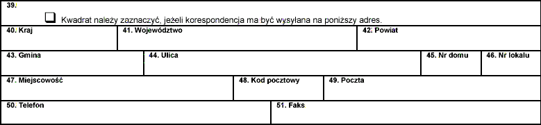 Jeśli jesteśmy zameldowani tam, gdzie mieszkamy, to pola 39 do 51 pozostawiamy puste. Jeśli natomiast mieszkamy w innym miejscu niż podany adres zameldowania, to w tych polach możemy podać adres zamieszkania. Nie ma jednak obowiązku podawania adresu zamieszkania. Niektórzy z zasady nie informują urzędów o tym, o czym nie muszą, zatem zaznaczamy to wyraźnie. Jeżeli regularnie odbierasz korespondencję z adresu zameldowania, US nie musi wiedzieć, gdzie przebywasz. Tym bardziej, że czasem udzielanie takiej informacji bywa niewygodne - patrz casus ministra, mieszkającego w Warszawie z kochanką... Gdyby często zmieniał garsoniery, ćwierć życia spędziłby na wypełnianiu tego druczka w wersji aktualizacyjnej.