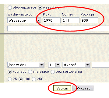 3. W linii "Adres publikacyjny" wypełnij pola "Rok", "Numer" i "Pozycja" i wciśnij przycisk "Szukaj". Pojawi się wyszukiwany dokument lub lista dokumentów.