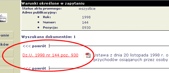 4. Wciskamy przycisk "Szukaj" i już mamy dostęp do poszukiwanego przepisu. Teraz klikamy na link określający Dziennik Ustaw w którym opublikowano przepis: