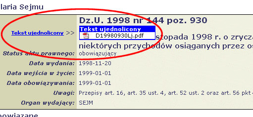 5. ...i otrzymujemy pełną informację o akcie prawnym. Gdy nasuniemy wskaźnik myszki na hasło "Tekst ujednolicony" otworzy się dodatkowe male okienko z zakodowaną nazwą pliku: