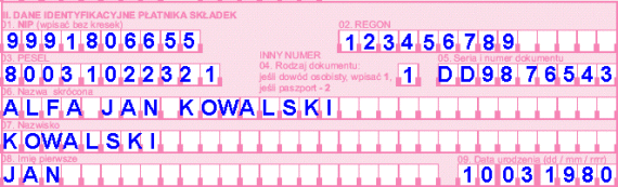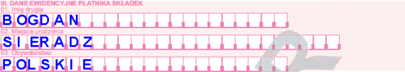 Szczytowo idiotyczna pułapka. W polu 01 działu III wpisujesz swoje drugie imię. Nie przejmuj się, jeśli z rozpędu wpisałeś pierwsze - wszyscy tak robią. :-) Wyrzucasz formularz i zaczynasz jeszcze raz, wysyłając w myślach dobre życzenia Prokomowi, ZUS-owi i obiecującemu ułatwienia dla przedsiębiorców rządowi IV Rzeczpospolitej.
