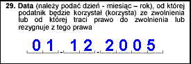 Pole 29 odnosi się do pola 28. Podajemy w nim datę od której będziemy korzystać ze zwolnienia, od której prawo do zwolnienia nam nie przysługuje lub od której rezygnujemy ze zwolnienia. Przykładowo jest nią 1 grudnia 2005.