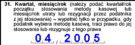 3 - rezygnujemy z prawa do stosowania metody kasowej - podajemy wówczas miesiąc i rok, np. 12/2005.